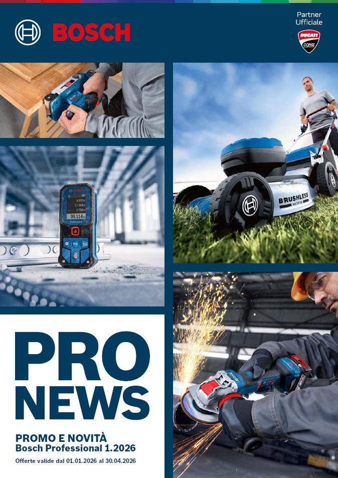 Volantino “PROMO E NOVITÁ 1.2026” dedicato ai professionisti di tutti i settori, con tutte le ultime novità e promozioni Bosch Professional valide dall’ 1 GENNAIO 2026 al 30 APRILE 2026